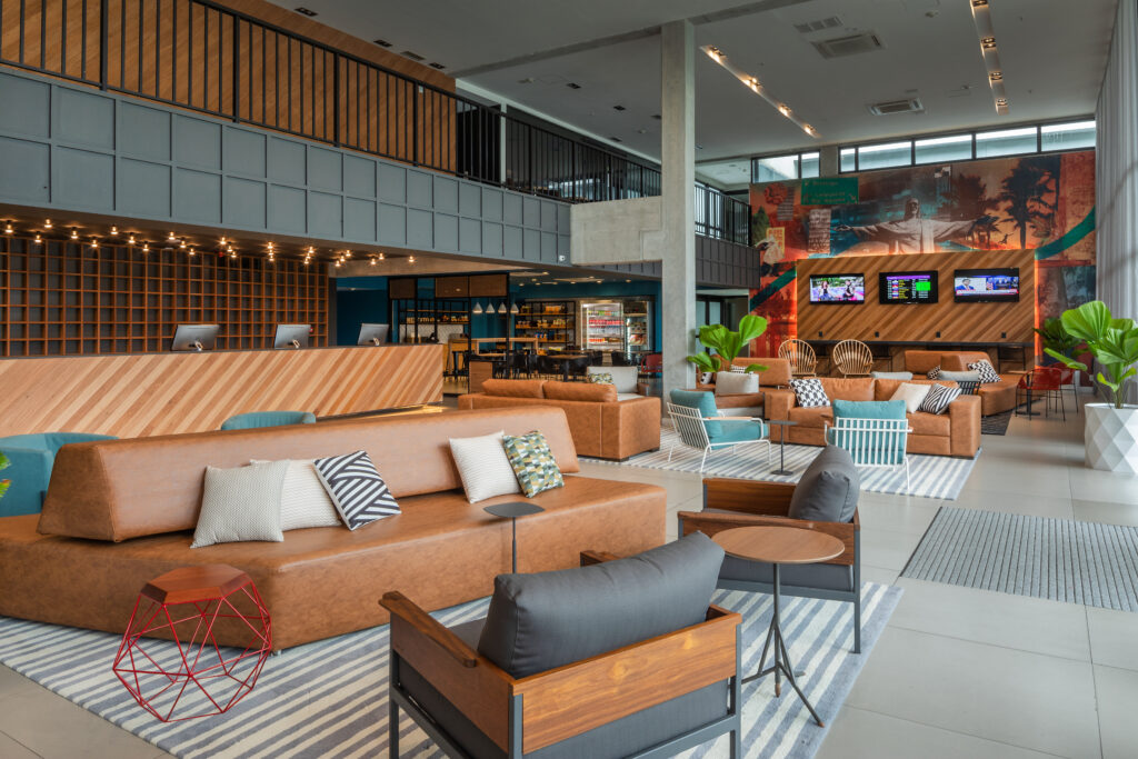Lobby colorido, telas com horário dos voos e salas de eventos versáteis
