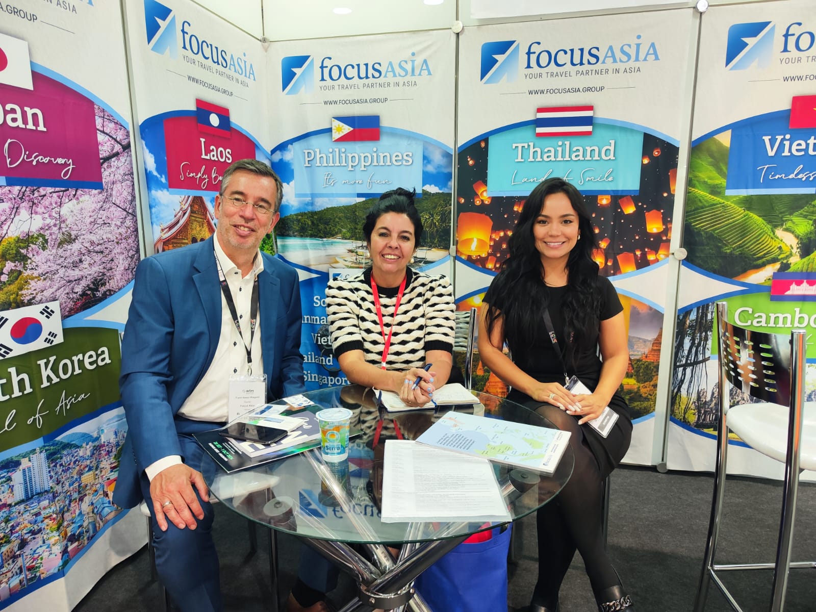 Foto (1) Templo budista em Bangkok, Tailândia. Créditos: Oliver Darny (via Pexels); Foto (2) Márcia junto ao Staff da Tailândia; Foto (3) Márcia no espaço destinado à agência de turismo Focus Asia