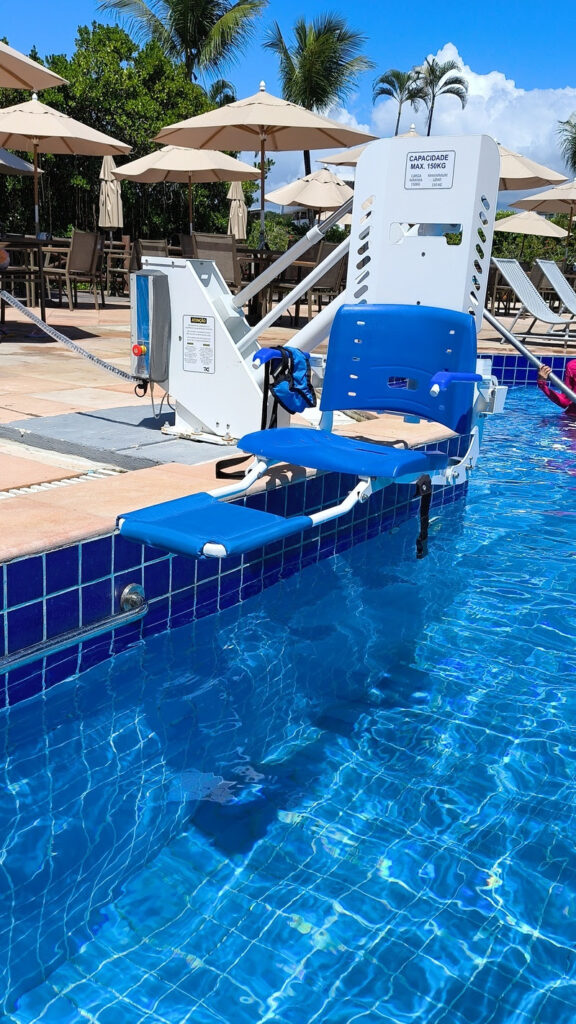 Depois de inaugurar a cadeira anfíbia para permitir o banho de mar a hóspedes com deficiência ou mobilidade reduzida, o hotel acaba de trazer às suas instalações a cadeira elevatória para piscina, equipamento projetado para facilitar o acesso a um dos principais ambientes de lazer do resort. Manejada por colaboradores especializados, a cadeira permite transferência segura, suave e gradual para dentro e fora da água, contando com cinto de segurança e mecanismo estável. O equipamento está disponível para uso das 9h às 16h, com agendamento na recepção e pode ser utilizado gratuitamente por até duas horas por um hóspede de até 140 quilos acompanhado por um adulto responsável.