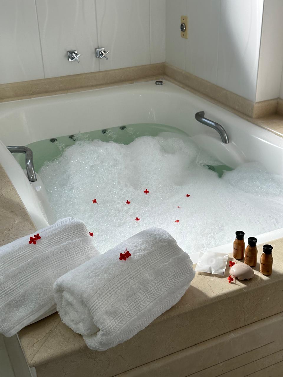 Luxo e requinte na suite Enseada, única com banheira privativa para dois, sacada e vista para a piscina . Foto: Divulgação