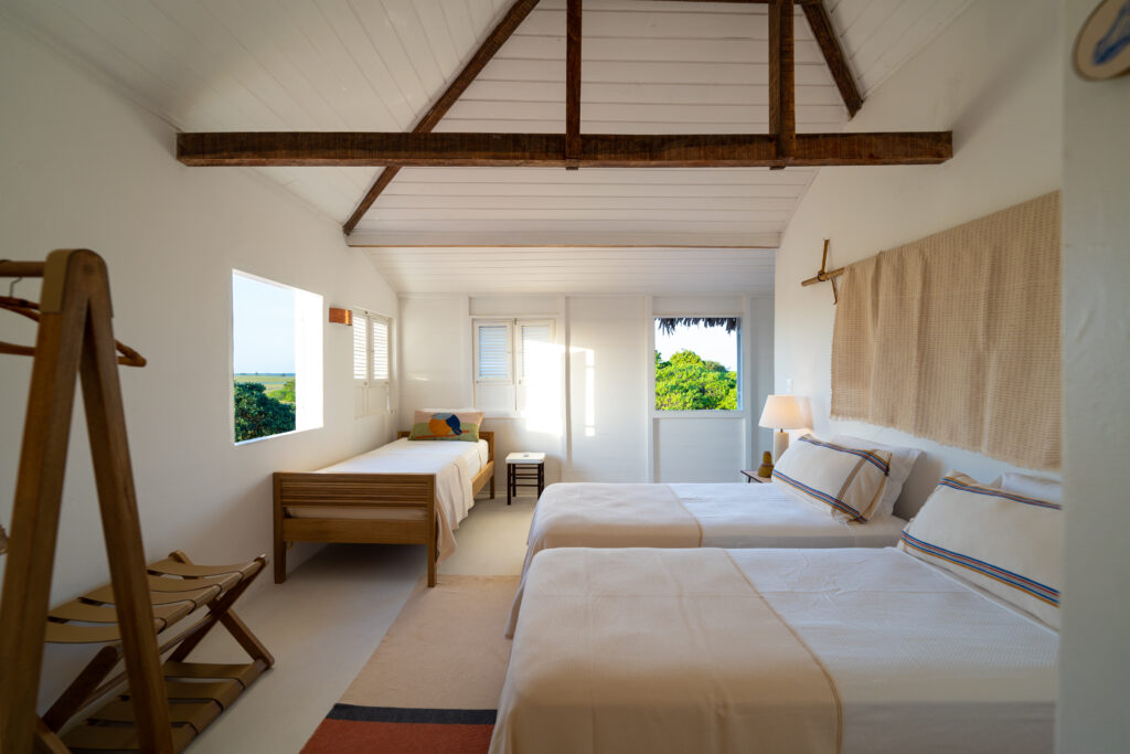 Inaugurado em 2023, o OIÁ Casa Lençóis está instalado na pequena vila de Santo Amaro, porta de entrada das maiores dunas e lagoas do parque e também a mais remota, preservada e silenciosa. O empreendimento ocupa o espaço de uma antiga fazenda restaurada, cercada por 52.500 m 2 de vegetação nativa e lagoas sazonais. Com apenas oito suítes – duas delas recém-inauguradas –, a OIÁ Casa Lençóis oferece um ambiente de privacidade, conforto e proximidade à natureza. A decoração, assinada pela designer Marina Linhares, combina modernismo brasileiro e artesanato regional, criando uma atmosfera sofisticada e ao mesmo tempo enraizada na cultura local. Poltronas Kariri em palha de buriti, móveis de Carlos Motta e obras de artistas como Lídia Lisboa, Gê Viana e Zimar reforçam o caráter autoral do projeto. A gastronomia valoriza ingredientes frescos cultivados em horta própria e insumos de produtores locais, traduzindo a riqueza da culinária maranhense com sofisticação. O sistema all inclusive contempla desde a culinária até os passeios, todos realizados com operadores licenciados e comprometidos com a preservação ambiental. Além disso, a OIÁ nasceu com compromisso sólido com sustentabilidade e desenvolvimento local, priorizando energia solar, gestão de resíduos, fornecedores da região e capacitação de moradores.