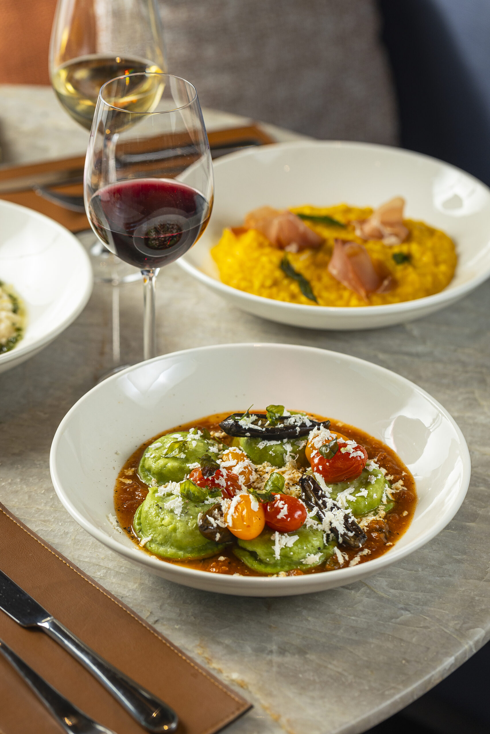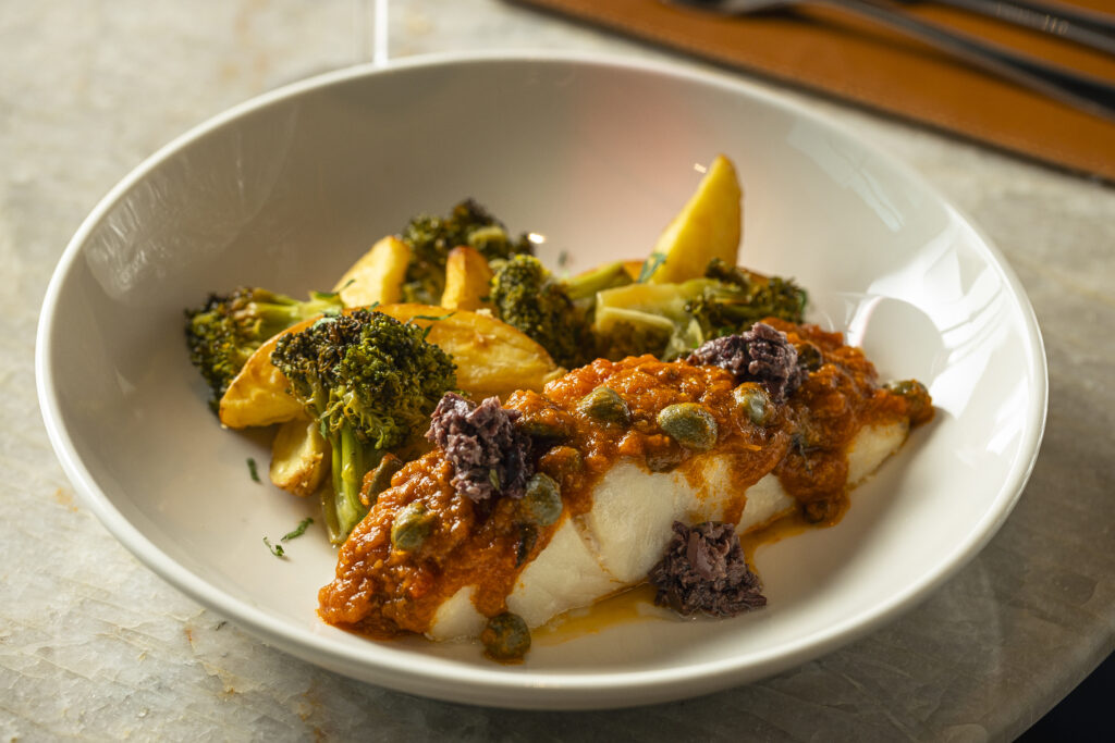 Entre as massas, destaque para o Spaguetti Carbonara (R$63), Rigatone Al Pesto (R$65), Lasagne Alla Bolognese (R$62) e Ravioli Alla Norma (R$65). A casa também oferece pratos de carne, frango e peixe, como Paillard Alla Nerano (R$80), Pesce Alla Ghiotta (R$82) e Pollo Arrosto (R$65), sempre acompanhados de guarnições que equilibram sabor e apresentação, mantendo a essência da culinária italiana com toque contemporâneo.