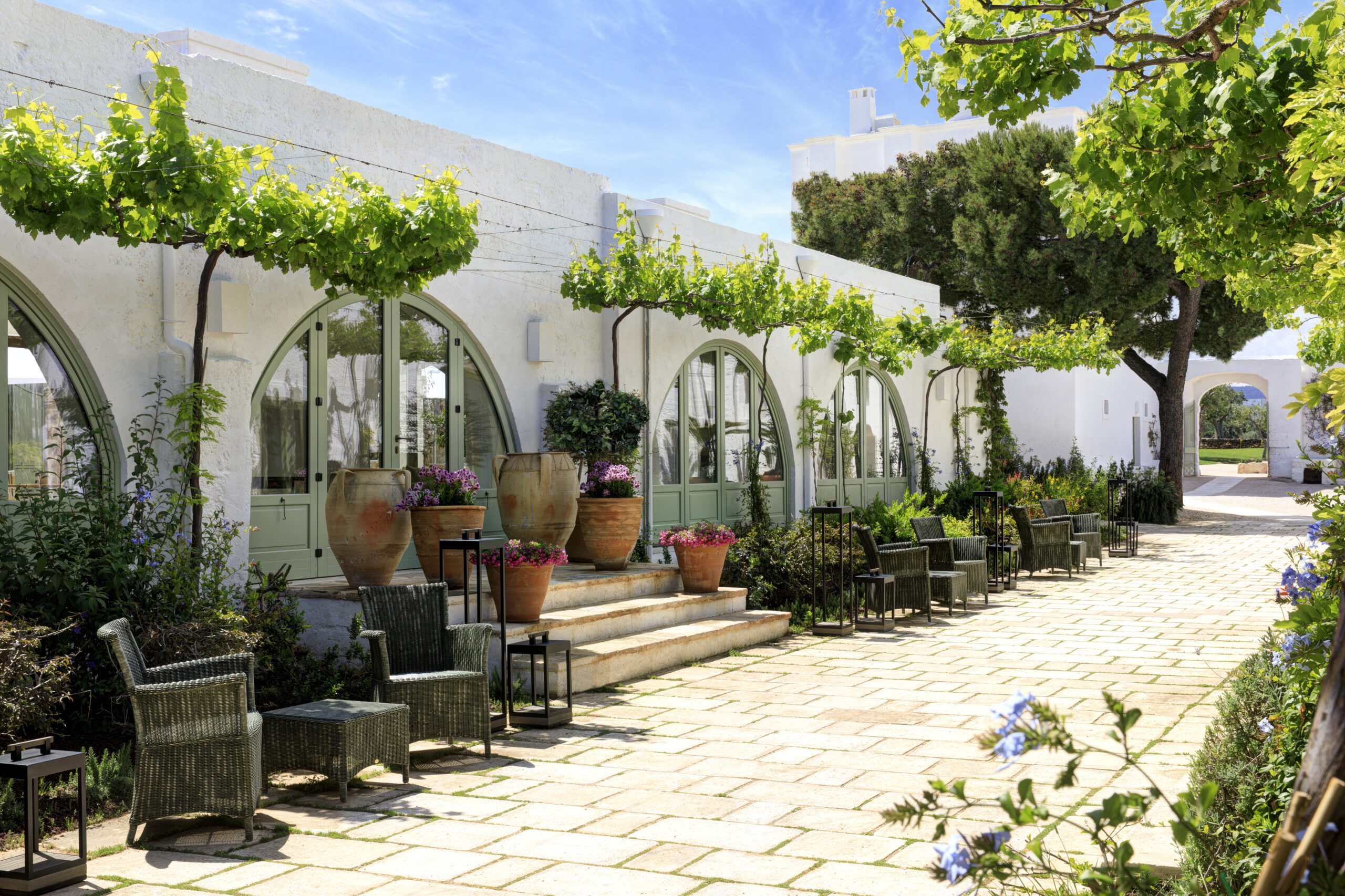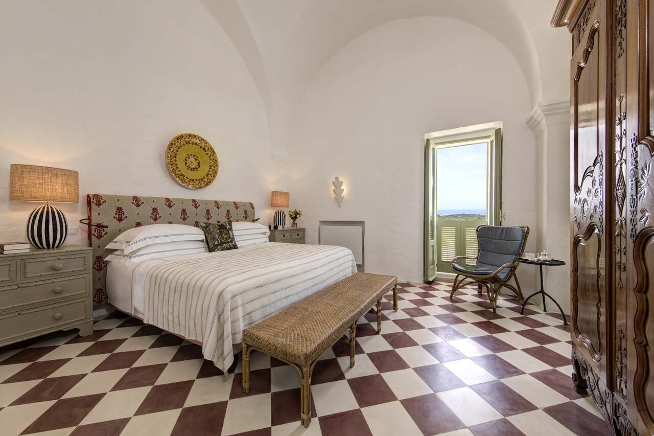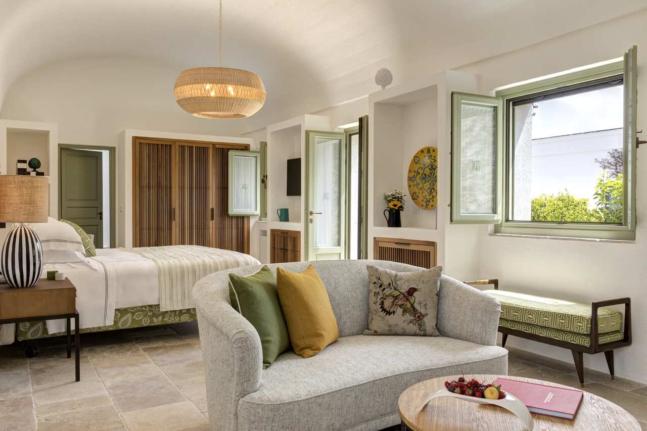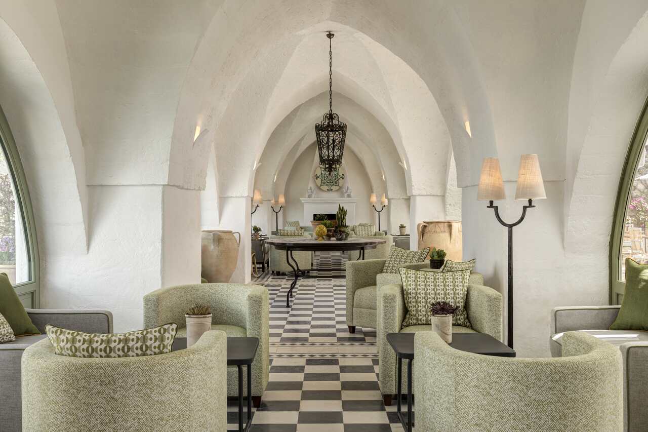 A arquiteta Olga Polizzi, responsável pelo design do hotel, soube equilibrar história e contemporaneidade. Trabalhou com artesãos locais, escolheu tons que remetem à terra e ao mar, e fez da masseria um espaço em que a herança pugliese encontra o conforto atual. O resultado é um ambiente em que o hóspede não se sente apenas em um hotel, mas em uma extensão natural da paisagem que o cerca.