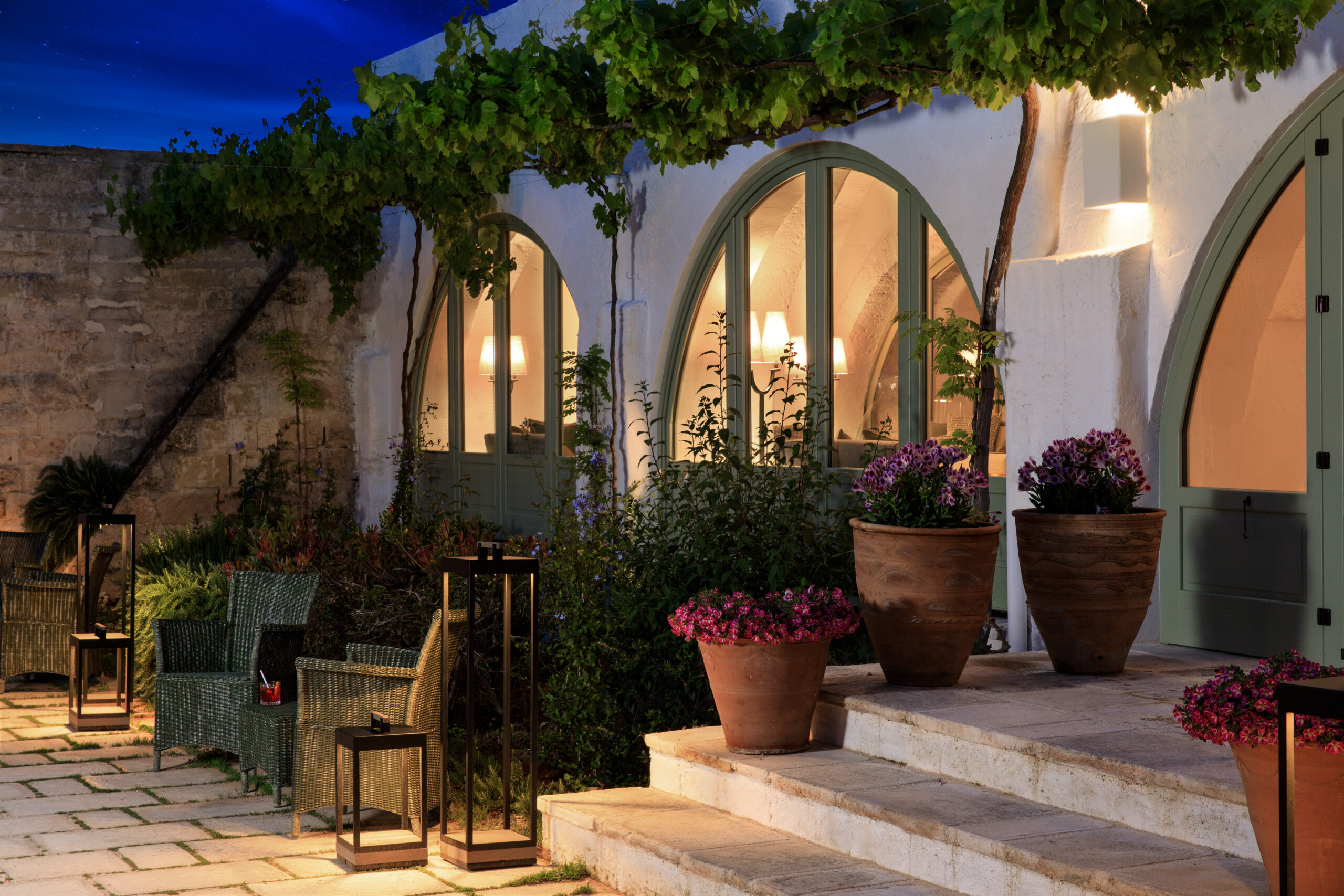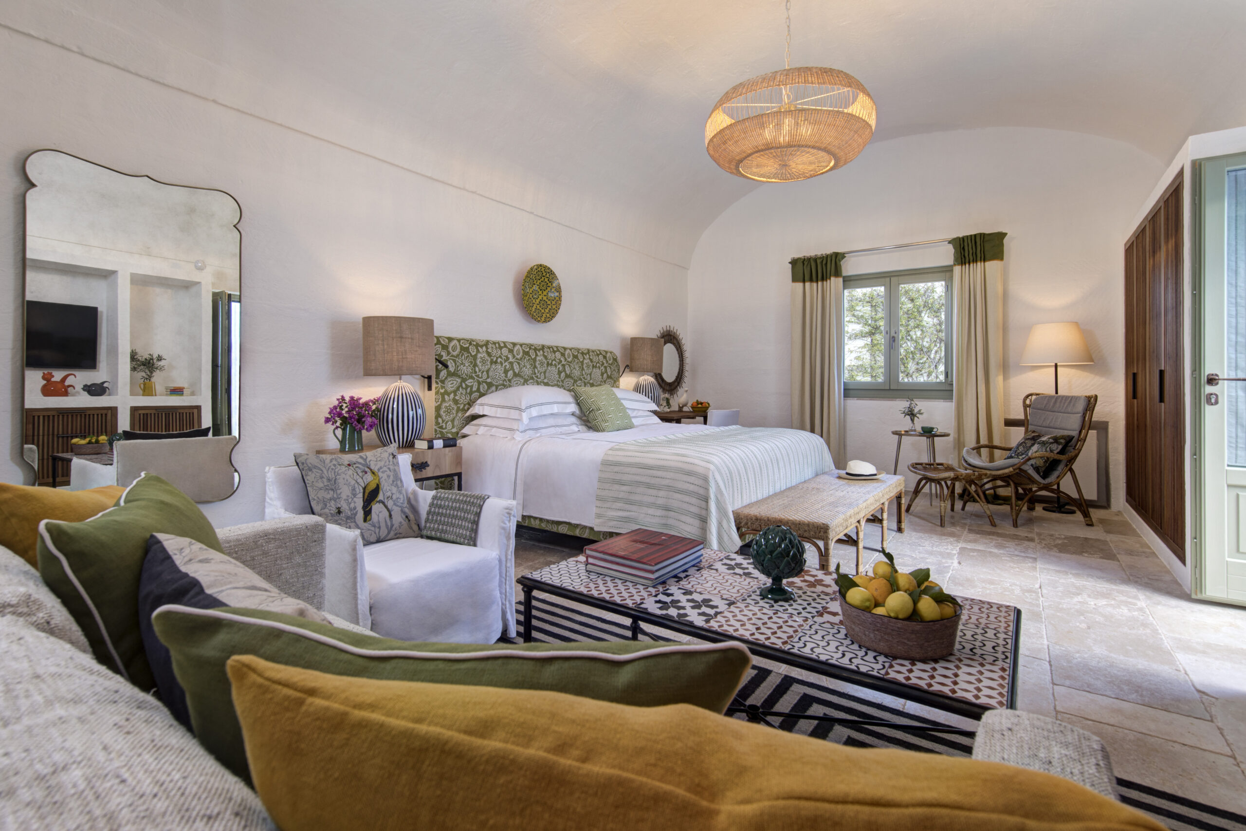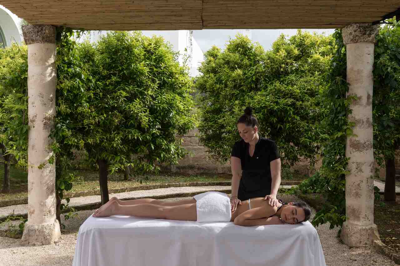 A arquiteta Olga Polizzi, responsável pelo design do hotel, soube equilibrar história e contemporaneidade. Trabalhou com artesãos locais, escolheu tons que remetem à terra e ao mar, e fez da masseria um espaço em que a herança pugliese encontra o conforto atual. O resultado é um ambiente em que o hóspede não se sente apenas em um hotel, mas em uma extensão natural da paisagem que o cerca.