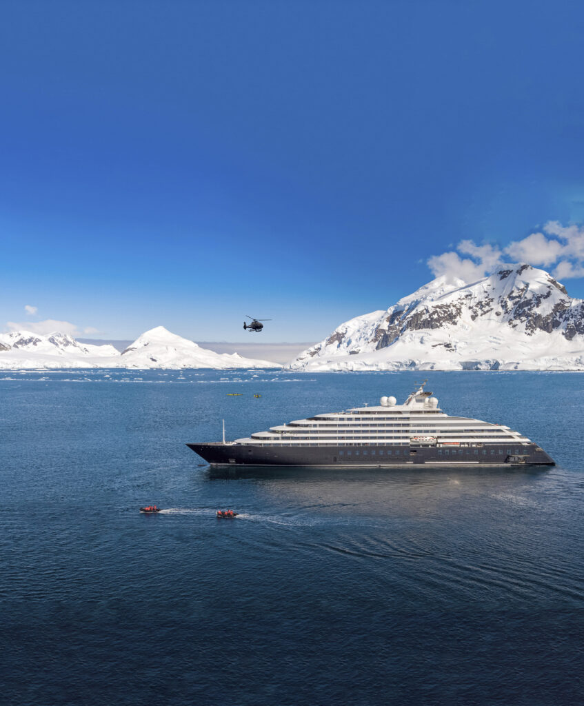 Com contornos elegantes de um iate à vela, o Scenic Eclipse é referência em cruzeiros oceânicos ultraluxuosos. Foto: Divulgação