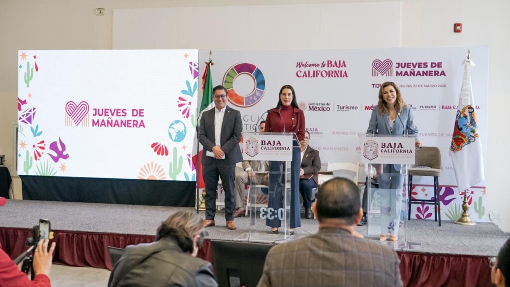 Emoção e muita assertividade marcaram o evento que anunciou oficialmente o Tianguis Turístico 2025. que ocorrerá de 28 de abril a 01 de maio, na Baja California Center, em Carretera Escénica de Playas de Rosarito, em Tijuana, México. “É um Tianguis para todos e todas. A sociedade poderá se envolver, porque vai além de um evento para operadores de turismo. Todos podem participar das ativações dentro e fora do centro de convenções, e este ano, compartilhamos essa experiência com outro país”, declarou. Ao apresentar os detalhes do Tianguis Turístico durante a Conferência Matutina a governadora Marina del Pilar Ávila Olmeda destacou que as atividades não se limitarão ao Centro de Convenções. Serão promovidas ativações em diferentes regiões da Baixa Califórnia e também em San Diego, Califórnia.Como parte da celebração da primeira edição de um Tianguis em cidades de dois países, ela ressaltou a realização de um evento gastronômico e cultural em Liberty Station, conhecida como “A Janela do México em San Diego”. O evento será gratuito e também aberto ao público nos dias 26 e 27 de abril de 2025, permitindo que os visitantes conheçam melhor a oferta turística do México.